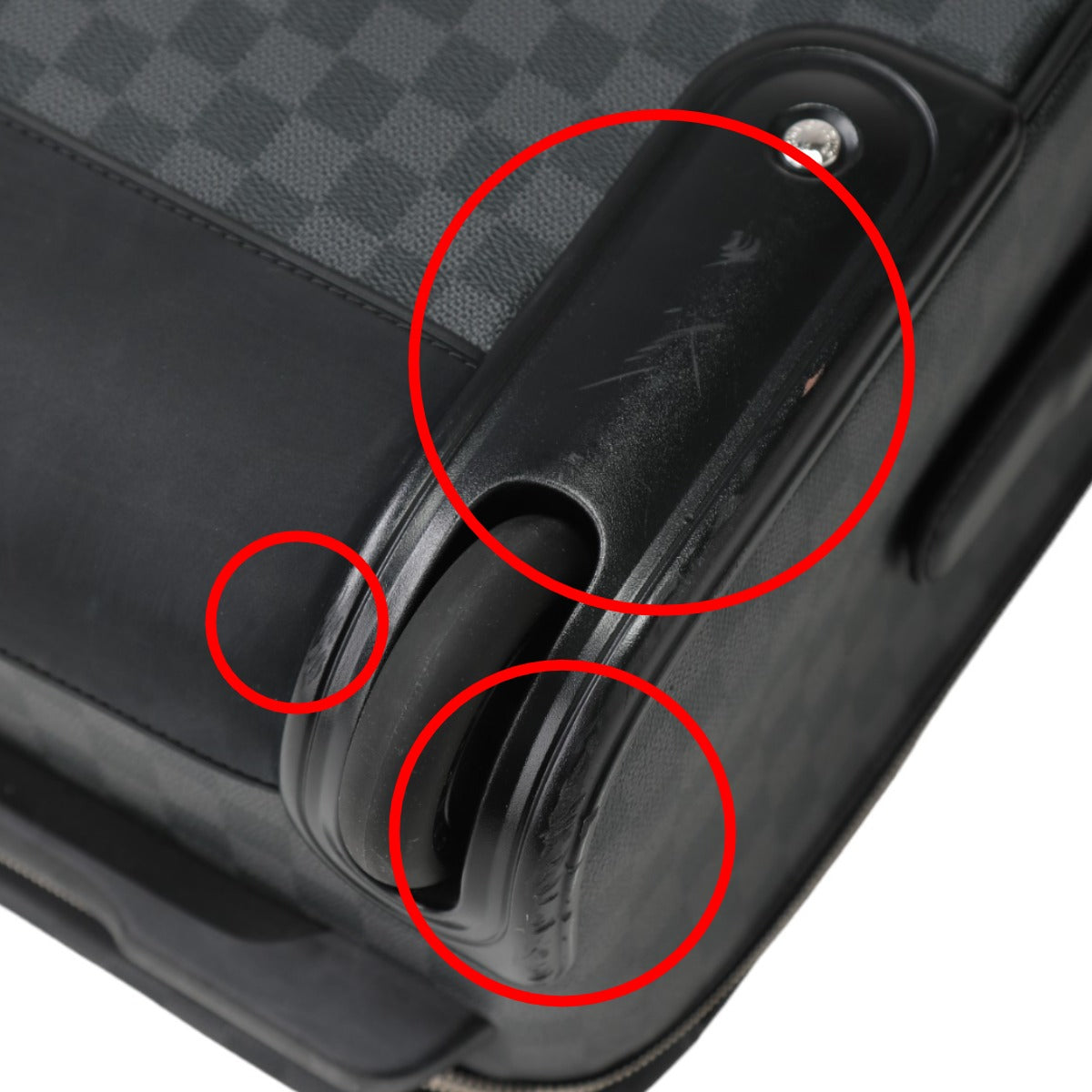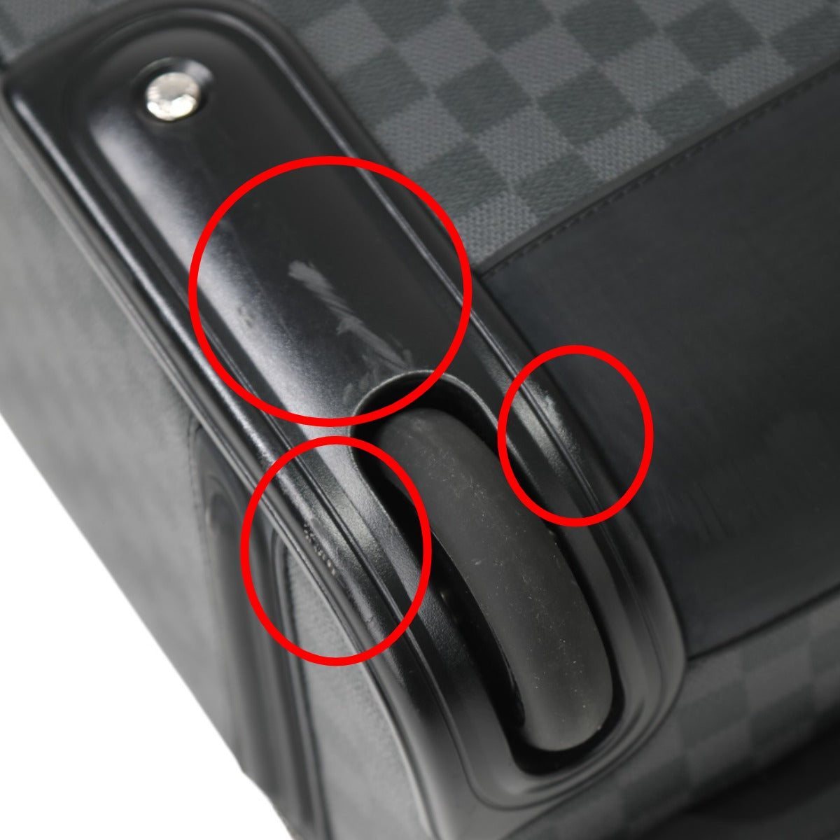 Rank:AB Handle/Strap: Scratches, dirt, wear Corners: Scratches, dirt, wear, damage Both tires have dirt and scratches (see images 12 and 13). There are scratches, dirt, and scratches on the plastic parts near the tires (see images 12 and 13). There are scratches on the corners (see images 10 and 11). There is a scratch on the plastic part near the telescopic handle (see image 16). Some parts of the bottom are sticky |